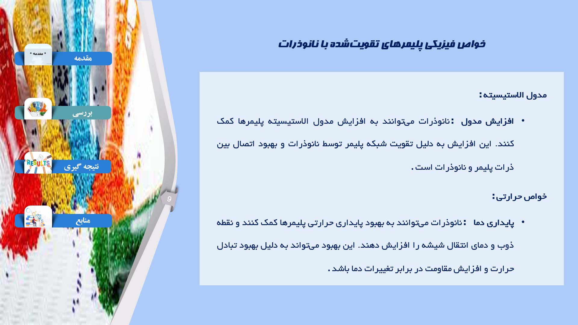 خلاصه ای از مطالب شرح داده شده در پاورپوینت در مورد خواص شیمیایی و فیزیکی پلیمرهای تقویتشده با نانوذرات